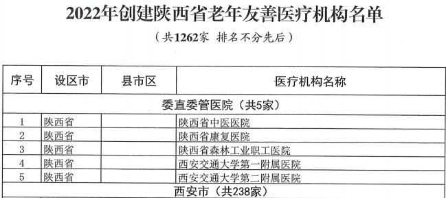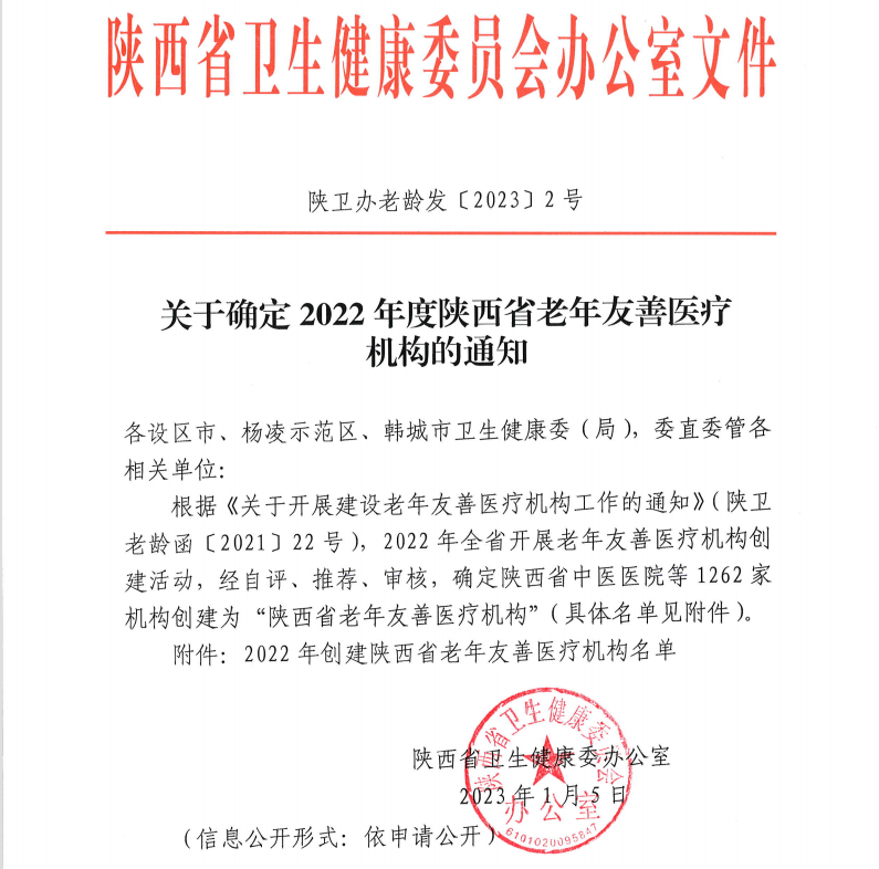 近日,在陕西省卫生健康委办公室发布的《关于确定2022年度陕西省老年友善医疗机构的通知》中,西安秋兰中医医院按照陕西省老年友善医疗机构评价指标的条款逐条落实、落地,最终被陕西省卫生健康委员会确定为 “2022年度陕西省老年友善医疗机构”。