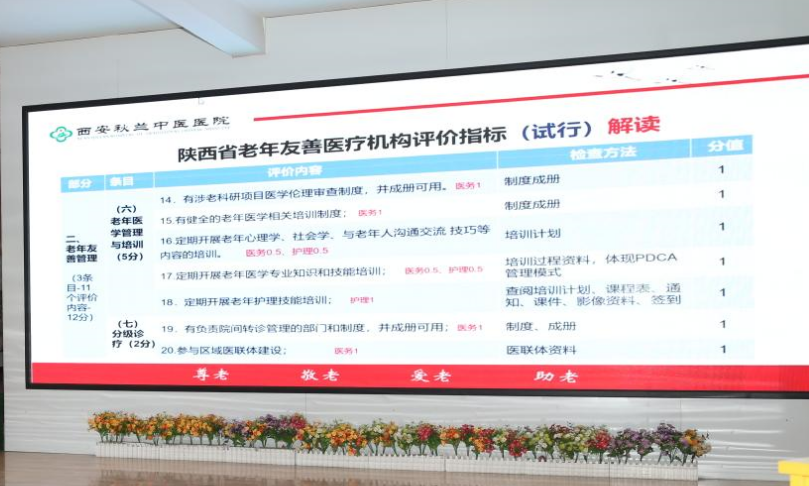 我院自启动“陕西省老年友善医疗机构”创建工作以来,严格按照陕西省卫生健康委员、陕西省中医药管理局《关于开展建设老年友善医疗机构的通知》文件精神,对标对准,扎扎实实开展老年友善文化、老年友善管理、老年友善服务、老年友善环境等方面建设。