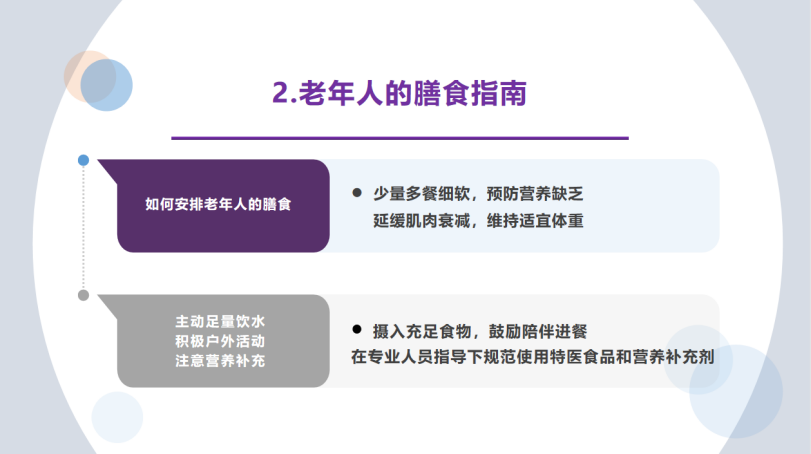 《中国居民膳食指南》要求:每天12种以上食物、每周25种以上食物。由于老龄化、疾病、情绪、生活环境等问题,老年人群更容易发生营养不良。对于营养不良的老人可以合理使用营养素补充剂。老年人肌肉衰减综合症是由疾病——卧床、脑卒中、骨折、糖尿病、COPD等疾病消耗增加肌肉流失;激素——年龄增加使雄激素、雌激素水平下降,造成骨骼肌的流失;缺乏运动、基因等原因造成。而预防肌少症两大法宝:营养与运动,可有效缓解骨骼肌丢失,改善骨骼肌健康。