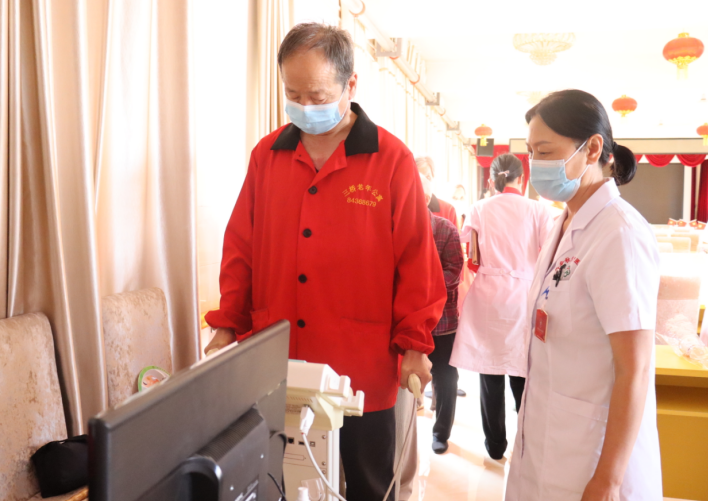 老人们在医务人员的陪同下进行人体成份分析测试